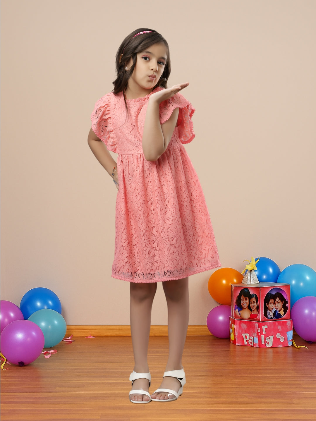 Floral Printed Pom Pom Lace Rayon Girls Dress - Peach