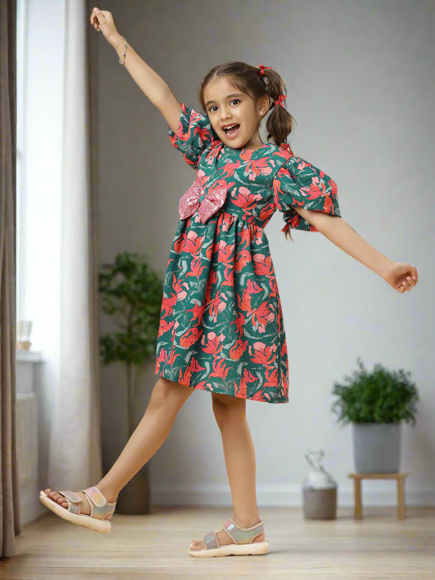 Polka Dot Printed Rayon Girls Dress with Bow - Red