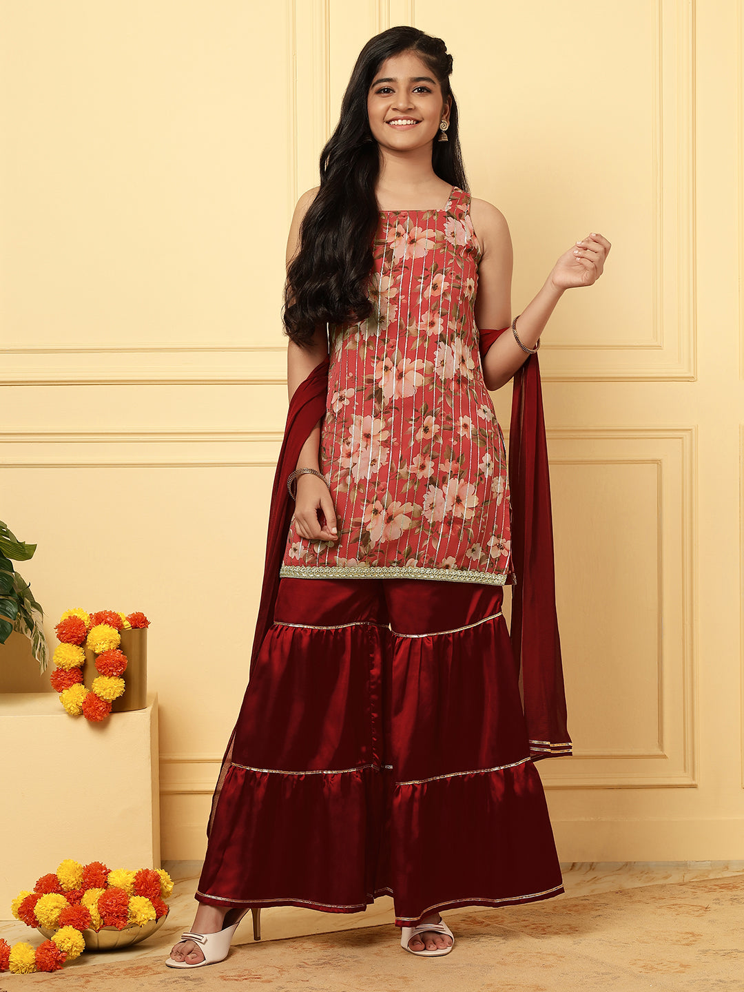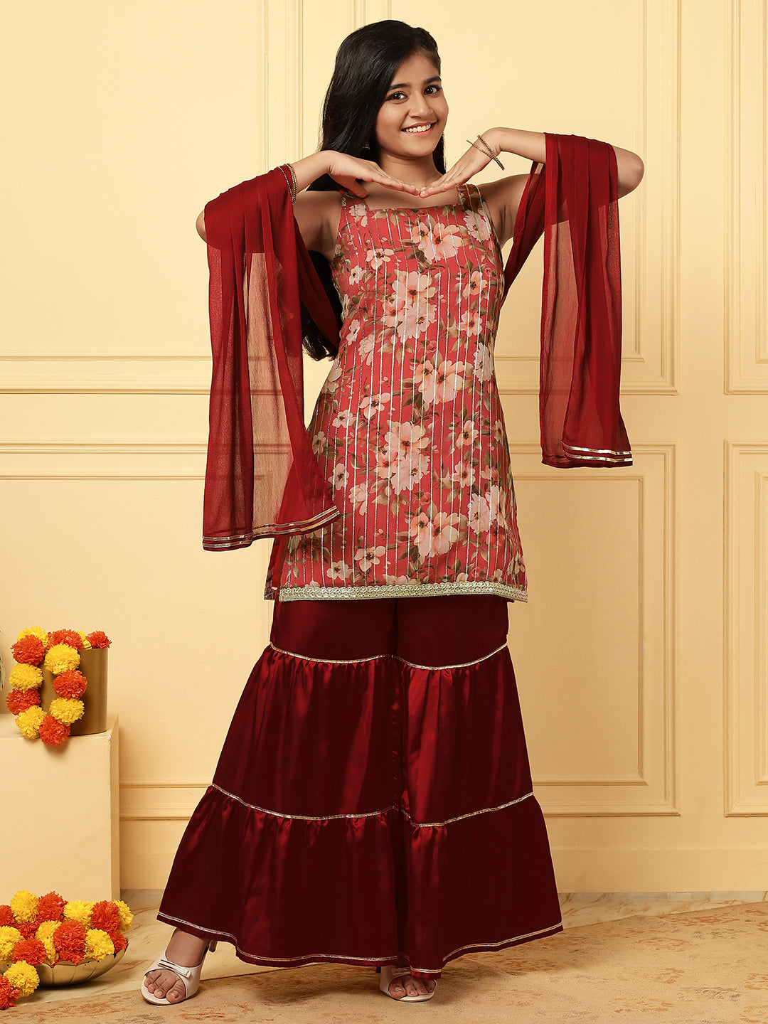 Girls Ethnic Floral Kurta and Sharara Set – Red