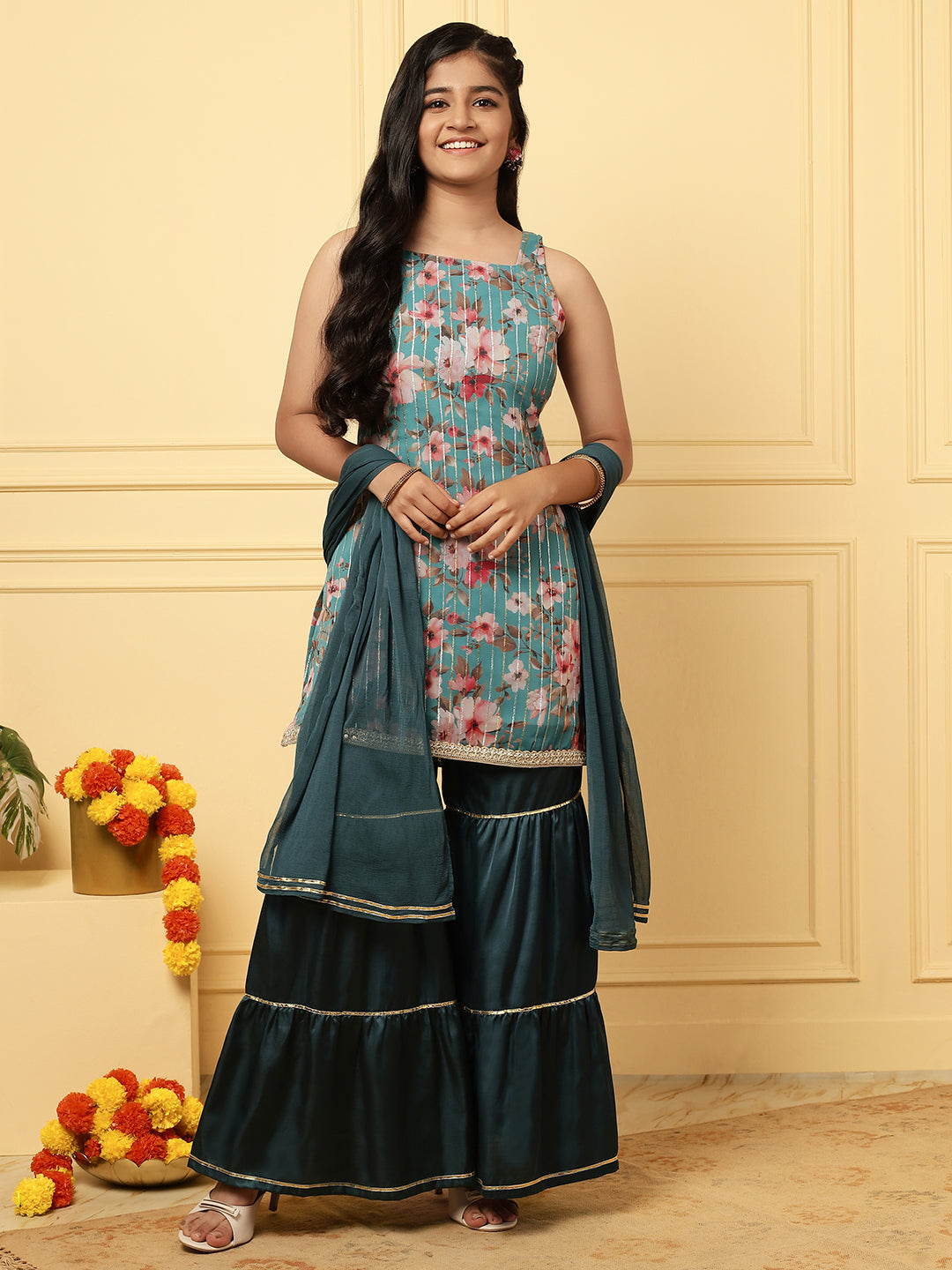 Girls Ethnic Floral Kurta and Sharara Set – Turquoise