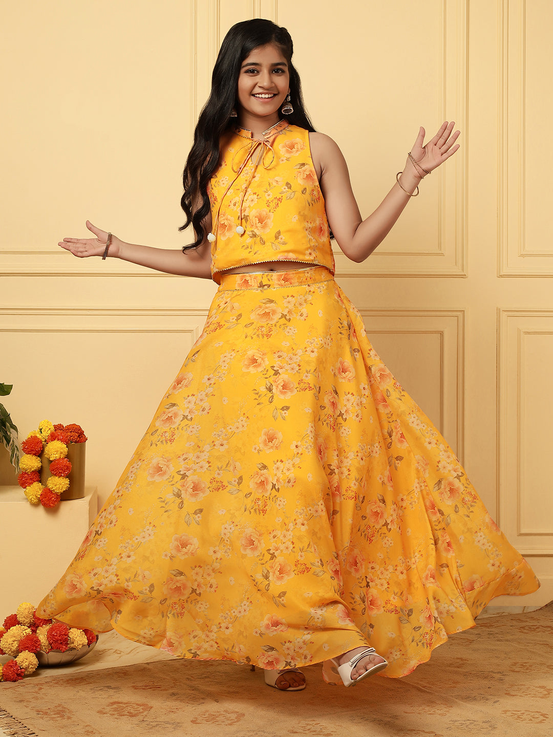 Girls Ethnic Floral Skirt and Top Set – Yellow
