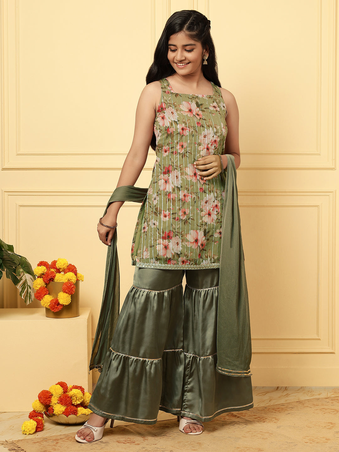Girls Ethnic Floral Kurta and Sharara Set – Green