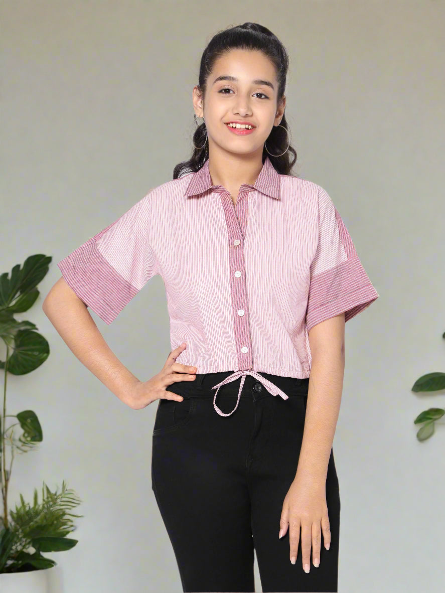 Earn admiration for your super trendy Crop shirt in cotton stripes from TeenTrums. This shirt style top made in cropped length is stylish and Trendy. The use of tonal fabric adds to its appeal. Exuding short sleeves, it is sure to fetch you compliments from others.